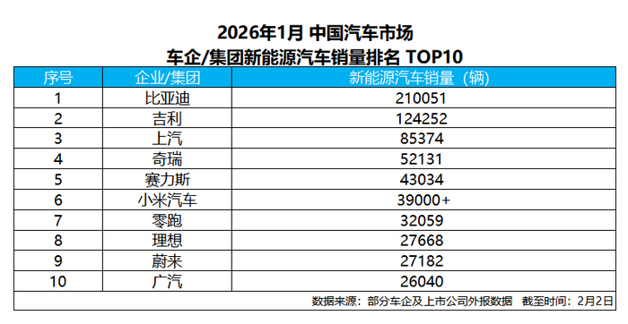 新年伊始,中国新能源汽车市场的竞争轮廓迅速显现,头部车企之间的差距在1月销量榜单中被进一步拉开。截至2月2日,根据部分车企及上市公司对外披露的数据,比亚迪以超21万辆的新能源汽车销量位居行业首位,展现出强大的市场竞争力,继续稳居中国新能源市场头部位置,并在主要车企中拉开明显差距。(深圳新闻网)