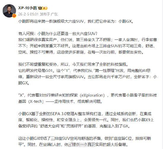 何小鹏刚刚宣布,小鹏汽车首款六座SUV小鹏GX官宣亮相。据悉,小鹏GX基于划时代SEPA 3.0“物理AI”整车架构打造,宣称能终结六座SUV长期存在的“不可能三角”。