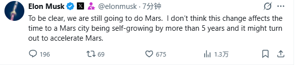 马斯克回应网友关于SpaceX将重心从火星转移至月球的帖子时称:“需要明确的是,我们仍然会推进火星任务。我认为这一改变不会使建设一个能够自我发展的火星城市所需的时间延长超过 5 年,而且最终可能会加速火星任务。”