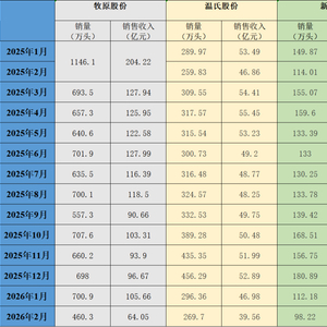 三大上市猪企牧原股份(002714.SZ)、新希望(000876.SZ)、温氏股份(300498.SZ)近日发布2026年2月生猪销售情况。从销量来看,三大上市猪企猪产品销量环比均下降,同比方面,牧原股份小幅下降,温氏股份和新希望同比增长。(澎湃新闻)