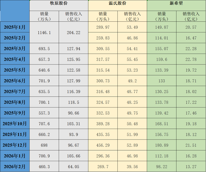 三大猪企2月生猪销量环比均下降,销售收入环比、同比均下降