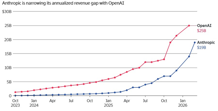 OpenAI的营收仍然高于其竞争对手Anthropic,但两家巨头之间的差距正在缩小:Anthropic的年化营收最近突破190亿美元,是去年年底的两倍,比两周前增长了36%。
