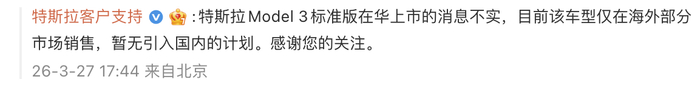 特斯拉辟谣Model 3标准版在华上市:暂无引入计划 滚动播报 03.28 09:22 3月27日,@特斯拉客户支持 在特斯拉官博评论区回复网友提问称,特斯拉Model 3标准版在华上市的消息不实,目前该车型仅在海外部分市场销售,暂无引入国内的计划。