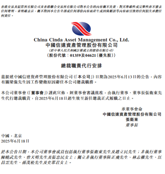 中国信达:执行董事、董事长张卫东代行总裁职责 金融一线 2025.06.1819:20 关注 6月18日金融一线消息,中国信达今日发布公告称,经董事会审议批准,由执行董事、董事长张卫东代行总裁职责,自2025年6月18日起生效至新任总裁正式履职之日止。