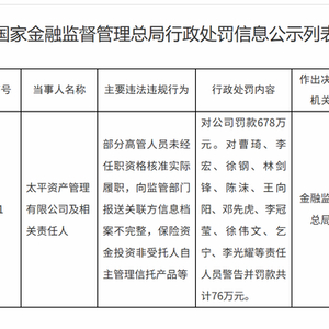 涉高管无证履职等三项违规 太平资管领678万元罚单