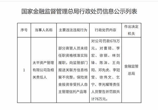 具体处罚措施显示,金融监管总局对太平资产管理有限公司处以678万元罚款,同时对曹琦、李宏等11名直接责任人员给予警告处分,并处以合计76万元的个人罚款。