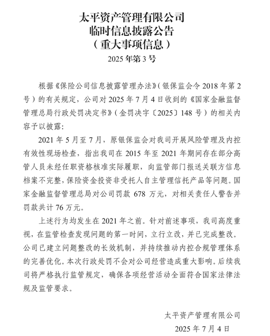 同日,太平资产管理有限公司发布重大事项临时公告,披露当日收到的国家金融监督管理总局行政处罚决定书(金罚决字〔2025〕148号)。此次披露的违规行为均发生于2015年至2021年。太平资管在公告中强调,针对监管检查发现的问题,公司已在发现问题时立即启动整改,并已完成全部整改工作。目前公司已建立长效整改机制,持续优化内控合规管理体系。据公告声明,本次行政处罚不会对公司正常经营产生重大影响,公司后续将严格遵守监管规定,确保经营活动合法合规。