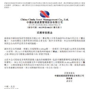7月18日金融一线消息,中国信达资产管理股份有限公司发布公告,披露其延迟寄发通函的事宜。该公司曾于2025年6月26日发布公告,内容涉及订立资产管理合同的主要交易。根据上市规则第14.41(a)条,原计划在2025年7月18日或之前(即6月26日公告刊发后15个营业日内),向股东寄发包含该交易进一步详情及上市规则规定其他资料的通函。