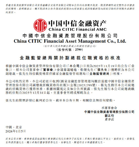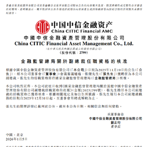 1月5日金融一线消息,中信金融资产发布公告称,张健已获得国家金融监督管理总局的任职资格核准,正式担任公司副总裁。张健的任期自2025年12月31日起,直至董事会另行聘任或解聘为止。
