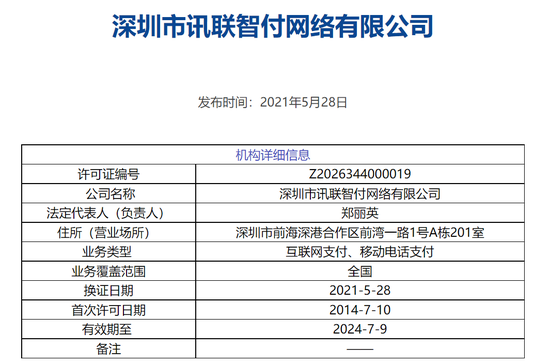 记者查询中国人民银行网站获悉,2014年7月,深圳市讯联智付网络有限公司获得支付牌照,业务类型为互联网支付、移动电话支付、数字电视支付,业务覆盖范围为全国。最新信息显示,目前开展的业务类型仅为互联网支付、移动电话支付,有效期至2024年7月。