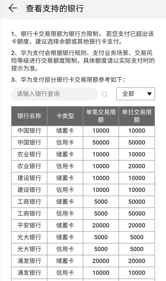 记者注意到,目前华为支付支持绑定的银行包括中国银行、农业银行、建设银行、工商银行、平安银行、光大银行、浦发银行、广发银行、民生银行、中信银行、上海银行、邮储银行、华夏银行、招商银行等160余家银行。