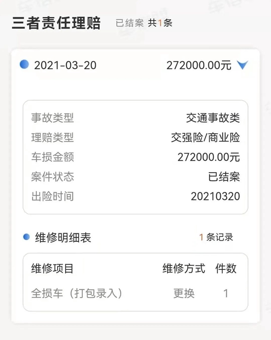 “检查当天,名尊奥翔4S店的销售人员查询相关资料,发现车辆在2021年3月发生过严重交通事故,当时还有保险公司的出险记录,我的这辆车当时被确定为全损车。”李先生的妻子表示。