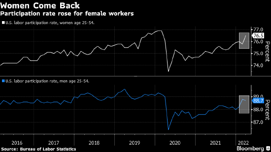 美国劳工统计局周五公布的就业报告显示,25-54岁之间主力劳动年龄的女性当月的劳动参与率跃升至76.5%,为2020年2月以来的最高水平。同一年龄段男性的参与率则小幅走低,之前一个月一度大幅跃升。