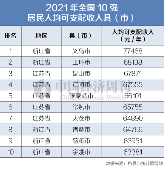 2021年,我国县(市)居民谁的幸福感最强?《中国经济周刊》记者梳理2021年全国10强县(市)居民人均可支配收入发现,浙江和江苏两省平分秋色,各占5席。相比之下,浙江更为强势,义乌市以人均可支配收入77468元/年居首,玉环市排名第二位,人均可支配收入是68138元/年;江苏省昆山市位列第三,人均可支配收入是67871元/年,比排名第一的义乌少了9597元/年。