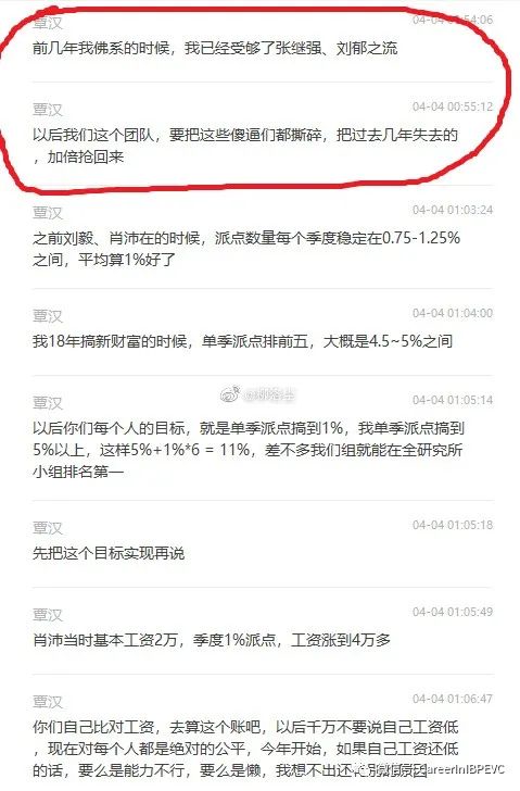 目前券商分析师的收入依靠公募基金派点,流传出来聊天记录显示,券商首席要求底下员工疯狂工作,疯狂搞派点,往前面冲,冲不了就主动辞职换工作。