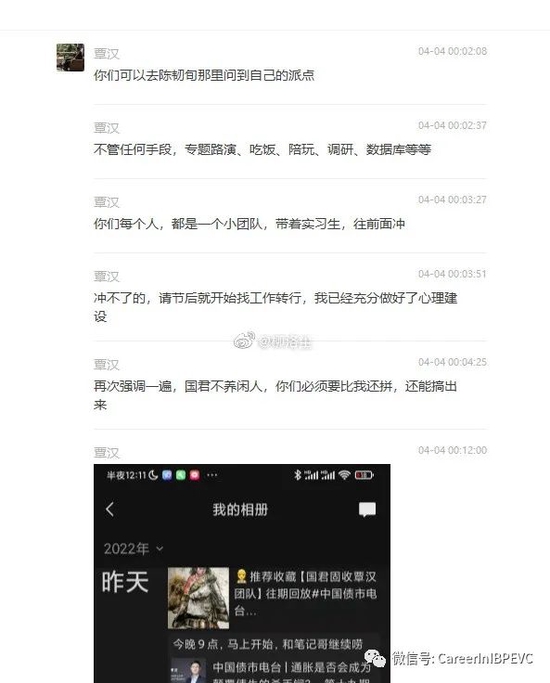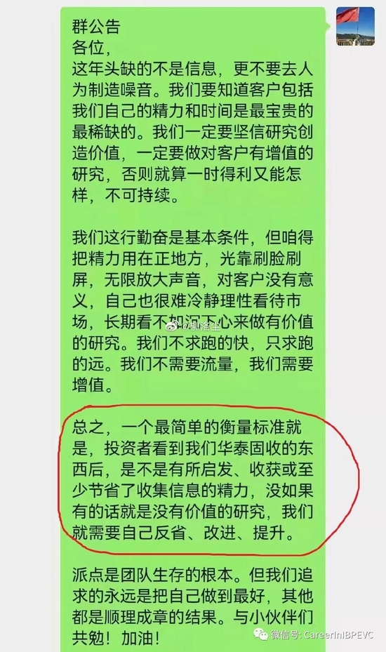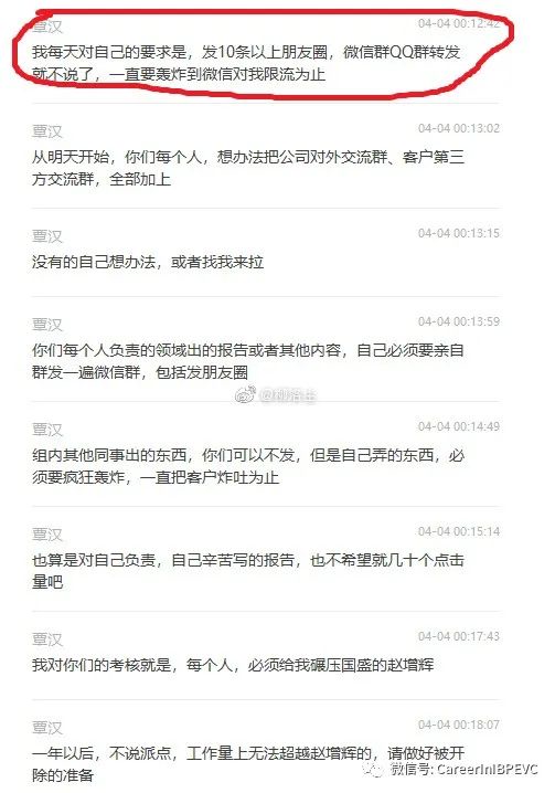 他还要求,每天要把研报狂发给客户,把客户轰炸到吐为止。声称自己每天发10条以上朋友圈,微信群QQ群转发就不说了,一直要轰炸到微信限流为止。并且声称,受够了XXX(点名其他券商首席)之流,要把过去几年失去的,加倍抢回来。