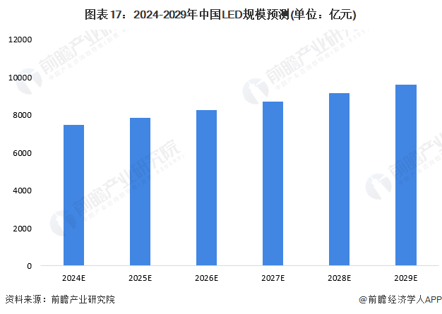近年来,LED的应用不断拓展新的市场领域,市场前景和容量十分巨大,为LED行业发展提供了很好的机遇。随着LED产品技术的快速进步,产品技术性能、能效比和经济性价比进一步提高,LED产品渗透率将不断提高,2011年开始是LED快速渗透的时间节点,LED行业整体产值规模以20%的增速高速增长。2017年开始,LED行业从基础技术渗透热潮逐步退却,正式进入了以高端技术驱动行业发展的阶段,该阶段正是以Mini LED以及Micro LED技术为核心进行发展的。基于以上发展情况,随着新冠疫情疤痕效应逐步减轻,全球宏观经济环境逐步修复,LED行业未来将以相较于2011-2017年较低的增速逐步企稳回升。初步以2017-2023年的增速均值预计LED行业以5.2%的增速增长,预计到2029年,中国LED行业整体市场规模达到9625亿元。