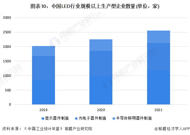 中国LED生产企业在中国工业企业中主要包括在显示器件制造、光电子器件制造以及半导体照明器件制造行业,2019-2021年期间,中国LED行业规模以上生产型企业数量呈现出逐年增长的态势,2021年共有2548家,其中包括显示器件生产企业1184家,光电子器件制造企业942家以及半导体照明器件制造企业422家。