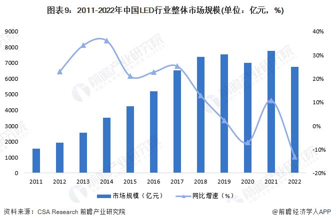 2011-2022年期间,中国LED行业市场规模呈现先持续上涨,后在高位波动的发展趋势。根据CSA Research的数据,2021年,我国通用照明出口以及显示市场回暖,Mini背光渗透率迅速提升,中国LED行业总产值有所回升,达到7773亿元,同比增长10.84%,为统计时间段内的最高值。进入2022年,在复杂严峻的国内外形势和多重超预期因素冲击下,LED行业下游需求不振,行业整体生产成本攀升,行业整体产值规模下滑13.16%,达6750亿元。