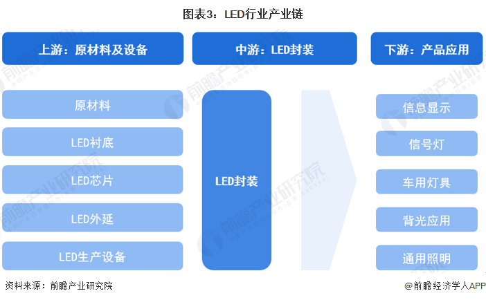 LED产业链包括原材料、LED衬底制作、LED外延生长、LED芯片制造、LED封装和LED应用等主要环节,一般将衬底制作、外延生长和芯片制造视为LED产业的上游,封装视为中游,应用视为下游。其中LED外延生长与LED芯片制造环节是全产业链的关键环节。