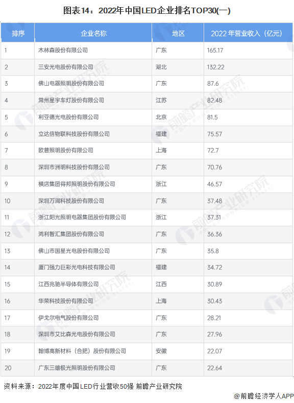 2023年6月9日,以“开启中国LED高质量发展黄金新十年”为主题的第十届中国LED首创奖颁奖典礼举行,中国LED首创奖共收到278家企业参评资料,经过组委会对申报企业的筛选、核查以及专家评审委员会的评审,最终公布2022年度中国LED行业营收50强。其中,木林森股份有限公司以165.17亿元的营收位列LED行业的首位。
