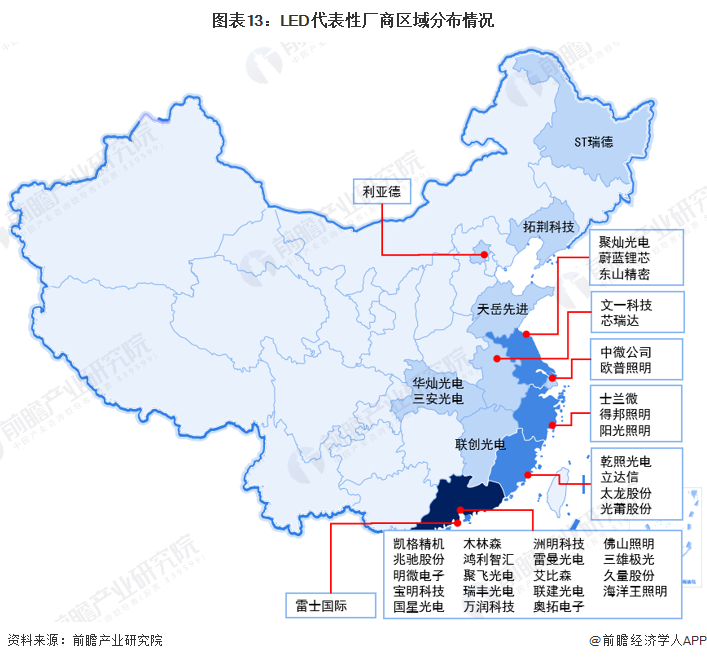 从LED产业链的区域热力图来看,可以看到广东省为我国LED产业链厂商分布最为密集的省份,其中LED领域代表性厂商接近20家;除此之外,福建省、浙江省以及江苏省在LED产业链的布局上均相对完善。