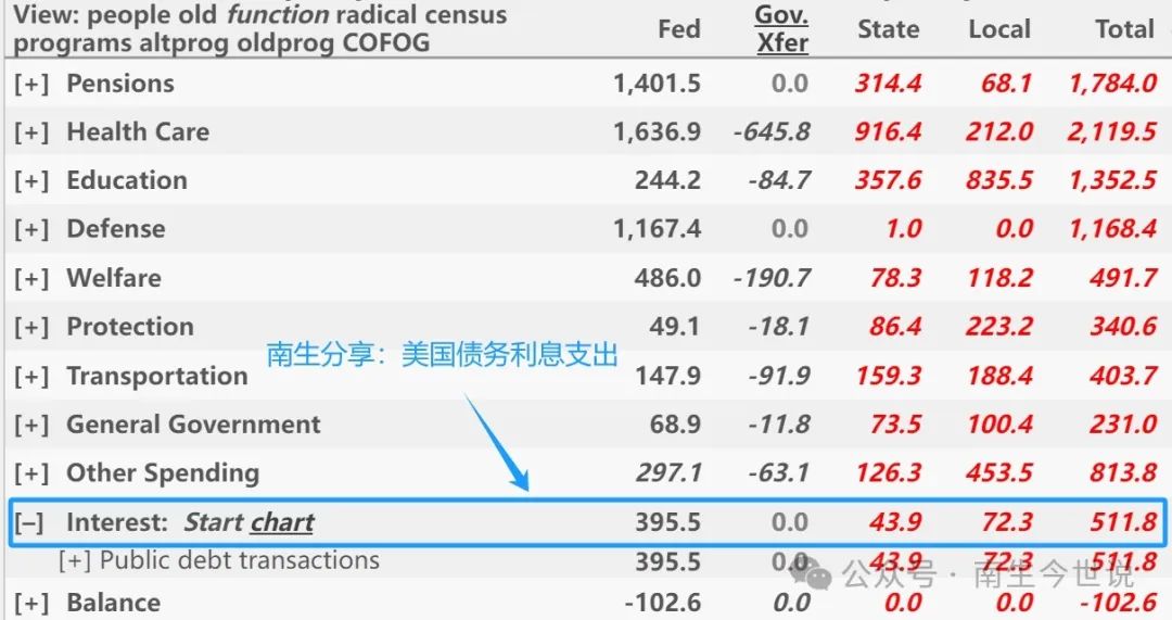 这接近10万亿美元的财政支出中,美国联邦政府的债务利息支出金额为3955亿美元,各州政府的债务支出金额为439亿美元,其他地方政府的债务利息支出金额为723亿美元。