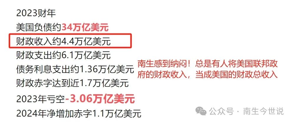 而且这个谣言,南生已多次驳斥了,但总有一些人不停地犯错,那就是:将美国联邦政府的财政收入,当成美国各级政府的财政总收入。这无疑是大大降低了美国的财政负担,美国老百姓是不答应的。