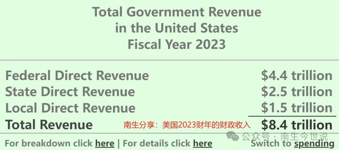 下为美国某知名财经分析网站的截图,可清晰地看到:2023财年,美国的财政收入总额在8.4万亿美元左右。其中,美国联邦政府的财政收入约为4.4万亿美元,占比超过50%。