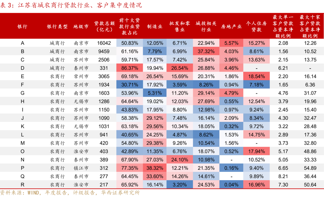 从贷款行业分布看,江苏城农商行贷款多分布于租赁和商务服务业、制造业、批发和零售业。具体来看,D、P银行贷款集中度比较高,前十大行业贷款占比均在75%以上,其中D主要是批发和零售行业贷款规模较大,P则主要集中于制造业(占比38.32%)。上市城农商行贷款行业集中度普遍较低,如常熟银行、张家港行、江苏银行等,前十大行业贷款占比多不超过60%。
