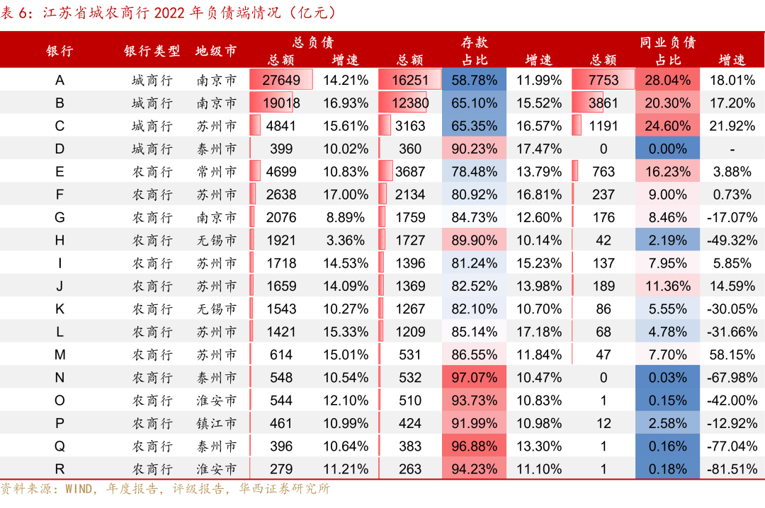 2022年,江苏省城农商行总负债与总资产同步扩张,存款也保持平稳增长。上市银行存款占总负债的比重普遍低于资产规模较小的农商行。尤其是江苏银行、南京银行和苏州银行这三家上市城商行,资本实力强,融资渠道丰富,主动负债占比较高,均在20%以上。其余部分上市农商行,也具备一定的风险承担能力,存款占总负债比重多在80%左右,同业负债占比多在5%-10%之间。而部分资产规模较小的农商行,90%以上的负债是存款,基本上不主动负债。