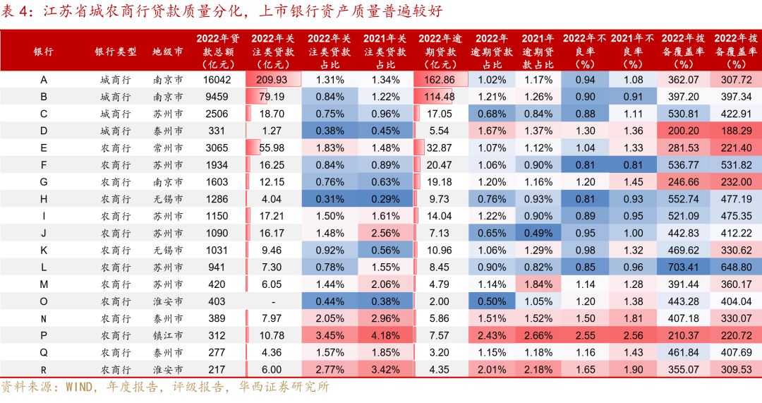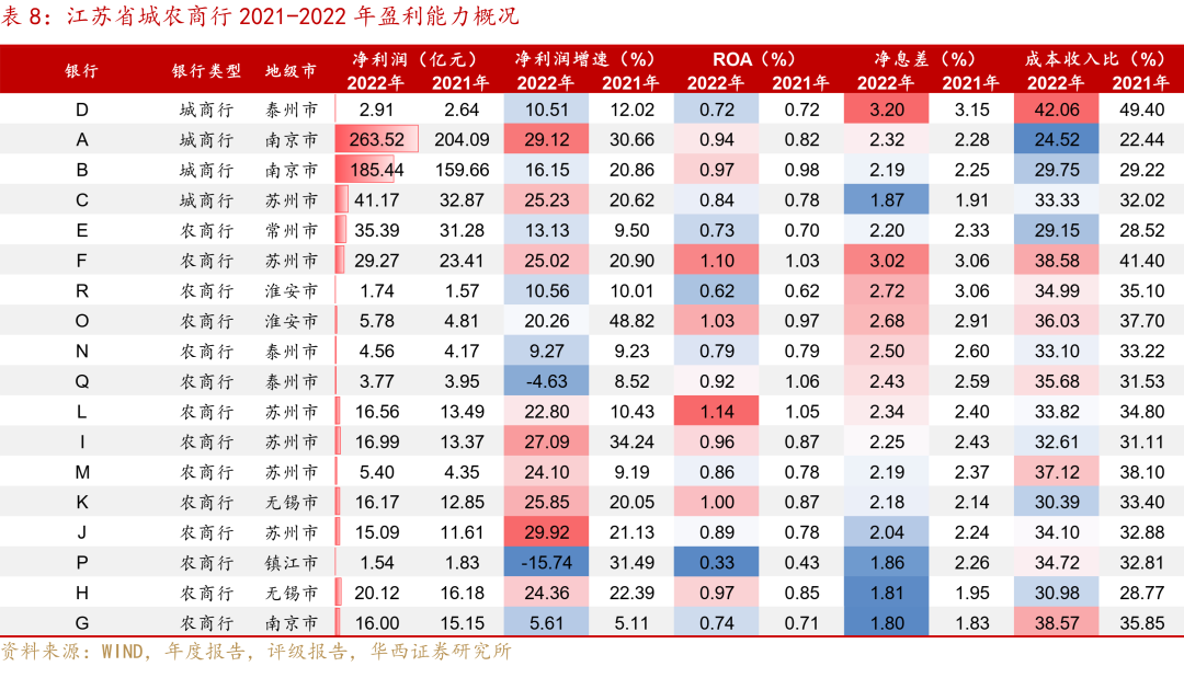 本篇报告,我们以江苏省18家发债城农商行(下列部分表述及图表中,银行名称用字母A-R代替)为样本,基于此分析框架,结合其2021-2022年各项指标表现及变动,综合分析其信用资质。