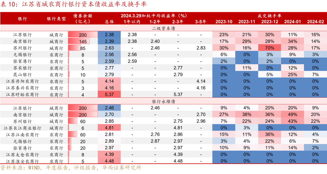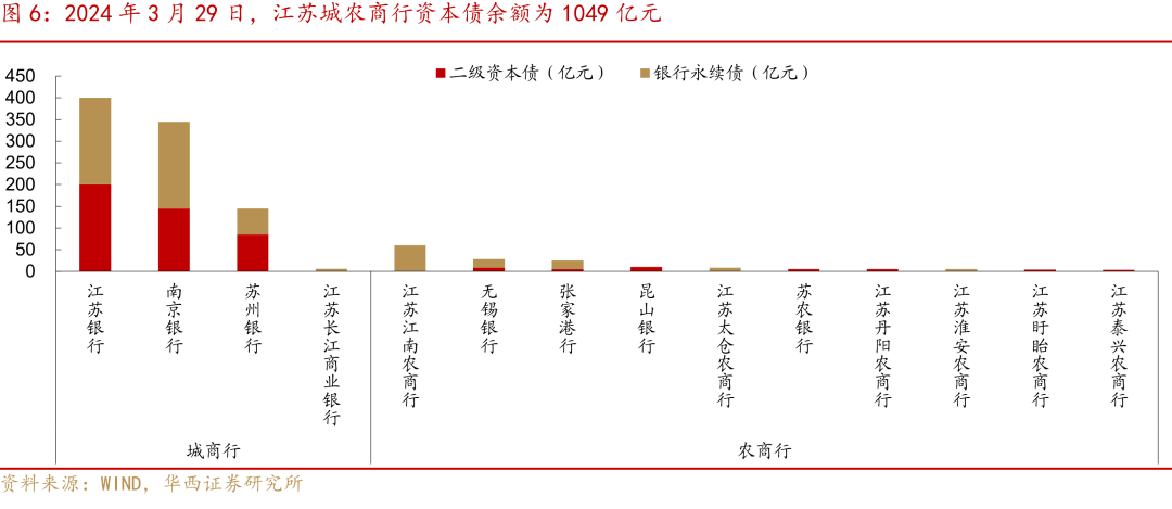截至2024年3月29日,有存量银行资本债的江苏省城农商行共有14家(包括4家城商行和10家农商行),存续的银行资本债余额为1049亿元,其中江苏银行、南京银行和苏州银行债券余额分别为400、345、145亿元。农商行中,江南农商行、无锡银行和张家港行资本债发行规模较大,余额均在25亿元以上。