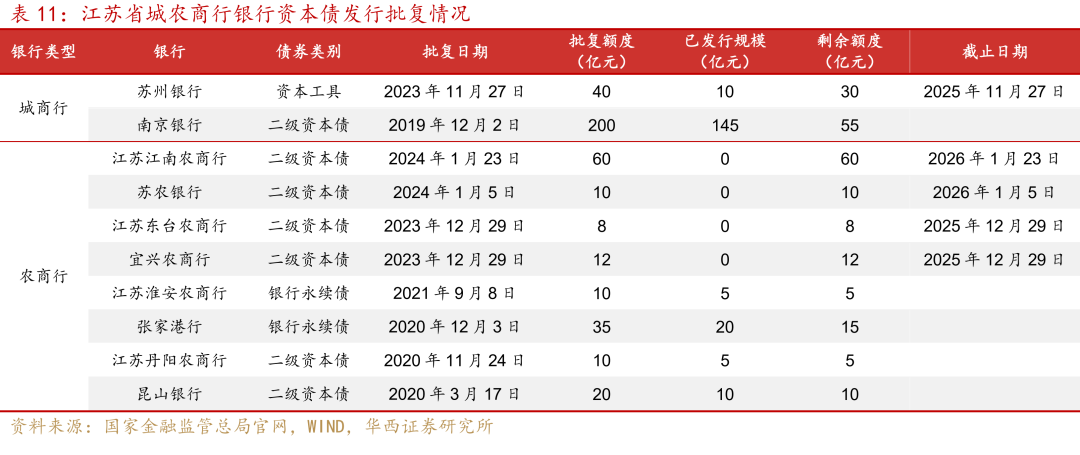 此外,也可择机参与江苏城农商行一级市场新发债。根据国家金融监管总局披露的银行资本工具发行批复文件,截至2024年3月29日,已批复未发行的银行资本债约1.24万亿元,其中城商行有1853亿元,农商行有708.32亿元。江苏省已批复未发行的城农商行资本债共210亿元,不过部分银行批复时间在2022年之前,后续可能不会再使用该额度。2023年11月以来,苏州银行、江南农商行和苏农银行新增了发行额度,目前剩余发行规模分别为30、60、10亿元,可以择机参与其一级市场新发债。