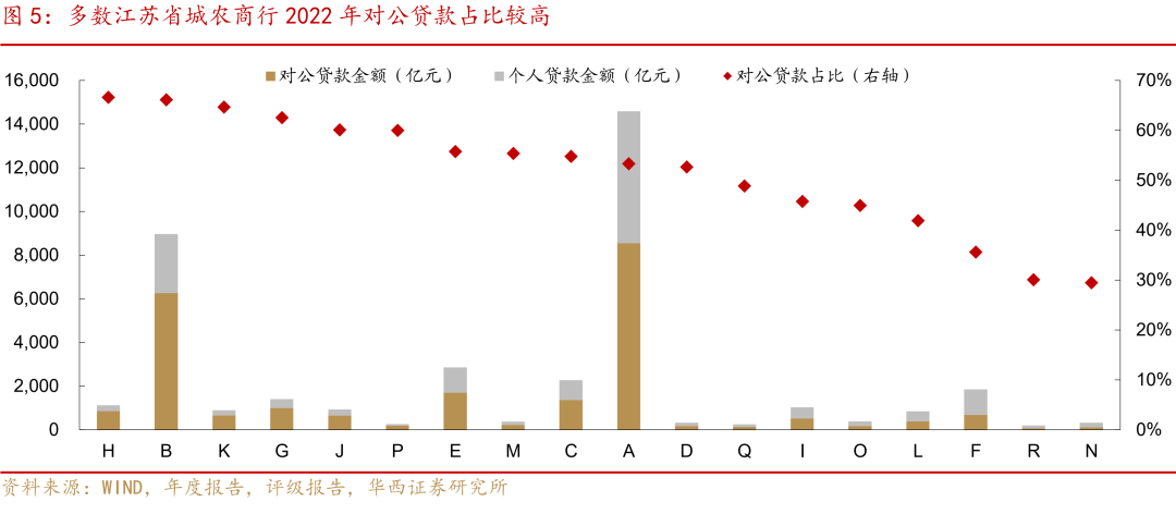 另外,江苏省城商行对城投相关四大行业(建筑业,交通运输、仓储和邮政业,水利、环境和公共设施管理业,租赁和商务服务业)贷款规模较大,占比均在20%以上,其中B银行达到37.32%。而农商行的对公贷款业务更多聚焦于当地的制造业企业,城投相关四大行业贷款占比普遍不高,只有G、H占比超过25%。