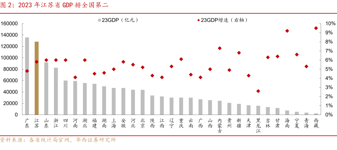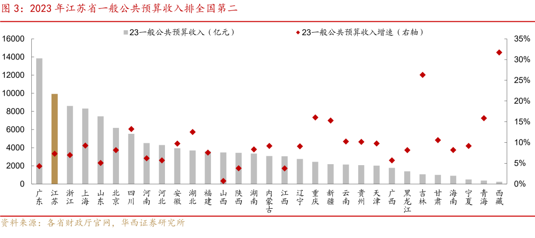 江苏省经济财政实力雄厚,下辖各地级市经济实力普遍较强,为区域内城农商行的业务开展提供了优渥土壤。2023年江苏省GDP总值达12.82万亿元,多年位居全国第二,仅次于广东,是全国唯二GDP达10万亿元量级的省份;GDP增速为5.8%,高于全国水平(5.2%)。2023年江苏省一般公共预算收入为9930亿元,也排在全国第二,增速为7.3%。