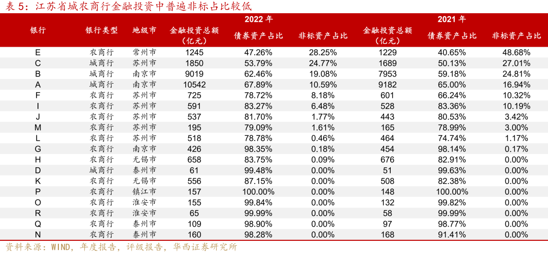 江苏省城农商行投资类资产中,主要投向政府债、政金债和同业存单这类高流动性的资产,多数银行非标类资产规模占比很低。如苏中苏北4家非上市农商行和丹阳农商行基本上100%投向债券,其余城农商行也会通过配置基金、非标产品等提高资产收益,不过非标占比普遍不高。苏农银行、太仓农商行、昆山银行和无锡银行金融投资中约有80%投向各类债券,非标占比不到2%,剩下15%-20%则多投资于基金。另外,近几年应监管要求,江苏省城农商行均在积极压降非标投资规模,2022年非标资产占比普遍同比下降,转而配置安全性较高的标准化资产。