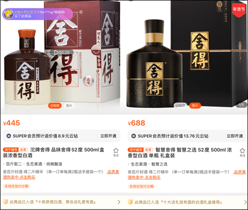 而苏宁上销量最高的“沱牌舍得苏宁自营旗舰店”中,52度500ml智慧舍得价格为688元/瓶。52度500ml品味舍得为445元/瓶。