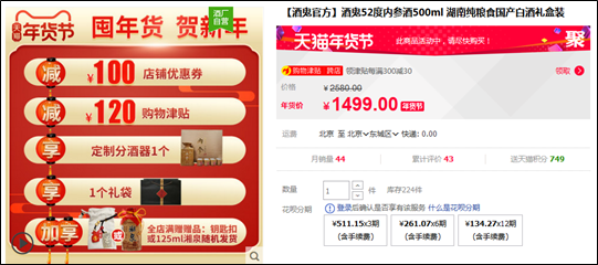5.天猫价,官方旗舰店显示年货价为1499元,但天猫为内参酒的礼盒装,礼盒含有定制分酒器和四个酒杯,此外还有220元优惠,合计到手1279元/瓶的礼盒装。