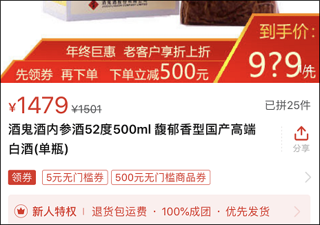 6.拼多多价,拼多多当前并无酒鬼酒官方旗舰店入驻,内参酒销售的均为第三方商家。名为柒玖玖酒类直供的商家,标价1479,高达505的购物券让拼多多平台的内参酒到手价降到974元/瓶。