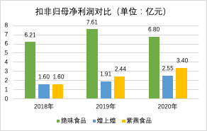 与A股上市的绝味食品、煌上煌相比,紫燕食品近三年的营收和利润增速表现都不错。虽然从规模来看,紫燕食品与行业龙头绝味食品仍有很大差距,但近三年紫燕食品的营收都高于煌上煌。就利润而言,2018年时,紫燕食品与煌上煌的扣非归母净利润都是1.6亿元,但2020年紫燕食品的扣非归母净利润已大幅超过煌上煌。
