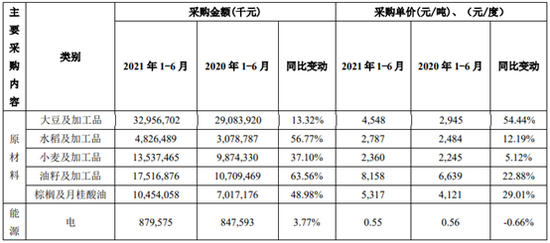 利润总额下降的首要原因就是原材料成本大幅上涨。上半年,金龙鱼多种原材料的采购单价均出现大幅上涨,其中大豆及加工品的采购单价较去年同期上涨54.44%。