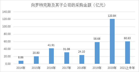 2014年以来,双汇发展向罗特克斯采购的金额逐渐攀升,2019年、2020年更是出现翻倍增长,采购金额占年度采购总额的比例从2014年的2.42%上升至2020年的21.14%。