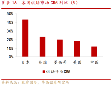 就行业格局而言,2019年我国烘焙行业CR5仅为11.89%,集中度显著低于日本(CR5为43%)、英国(CR5为23.2%)和美国(CR5为18.3%)等成熟市场。