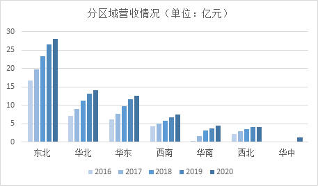 不过从营收情况来看,尽管目前桃李来自东北地区的收入占公司营业总收入的比重仍高达46.74%,但随着各区域工厂逐步投产释放产能,华东、华南、西南等重点开拓市场的营收规模也在快速增长。