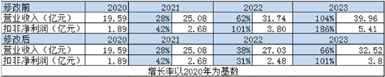 根据此前的标准中,2021年到2023年每年营收增速均超过25%,扣非净利润增速均超过40%。调低后2021年增速不变,2022年营收增速仅为7.8%,净利润增速甚至降到-7.59%。
