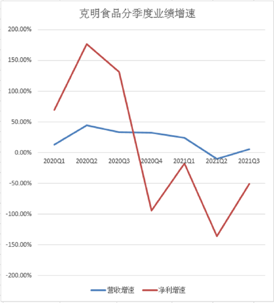 但是从2020年第四季度开始,克明食品净利润“变脸”,同比减少94.38%,当季净利润仅为416.3万元,此后直到2021年三季度净利润仍未止跌。营业收入增速也从2021年一季度开始逐季度走低。