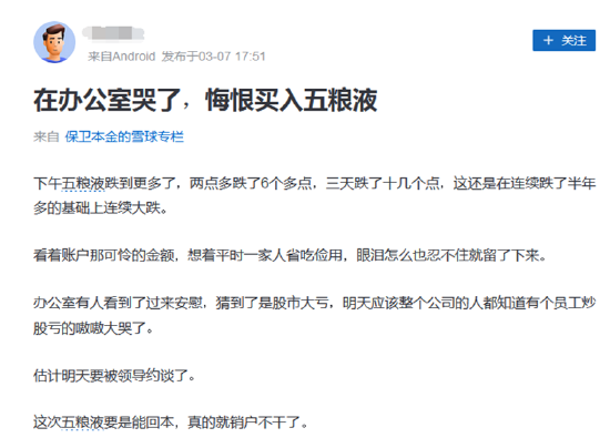 3月7日,有投资者在雪球上发帖哭诉“在办公室哭了,悔恨买入五粮液”。 “三天跌了十几个点,这还是在连续跌了半年多的基础上连续大跌”。“办公室有人看到了过来安慰,猜到了是股市大亏,明天应该整个公司的人都知道有个员工炒股亏的嗷嗷大哭了”。
