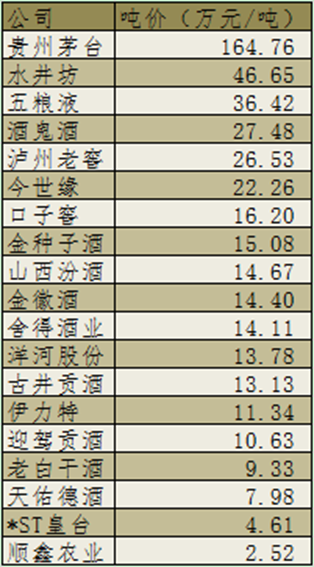吨价在10万元以下的酒企有四家,分别为老白干酒、天佑德酒、皇台酒业、顺鑫农业,其中顺鑫农业以2.52万元的吨价排倒数第一,甚至低于皇台酒业。