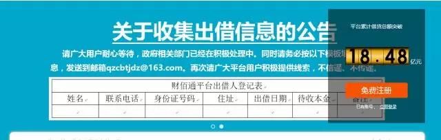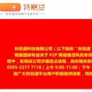 1月21日,财佰通官网首页突现一则红色公告。该公告称,根据国家和省关于P2P网络借贷风险专项整治工作部署要求,我市相关部门在对财佰通组织开展核查过程中,发现该公司涉嫌违法违规,政府相关部门已介入调查,并成立工作组进驻该公司。目前,财佰通科技有限公司已暂停相关业务。